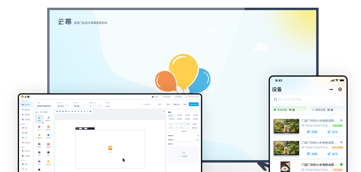 云幕是专为连锁品牌打造的智能数字标牌及门店音乐管理平台,轻松管理全国门店屏幕以及音乐,快速发布营销内容,提升品牌形象与顾客体验。多家头部品牌客户首选,长期在线数十万台设备。